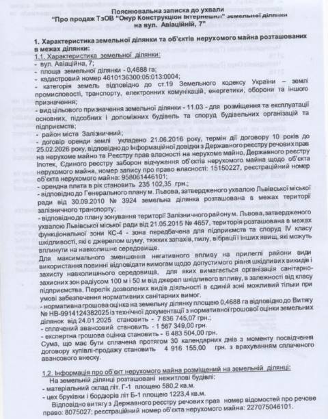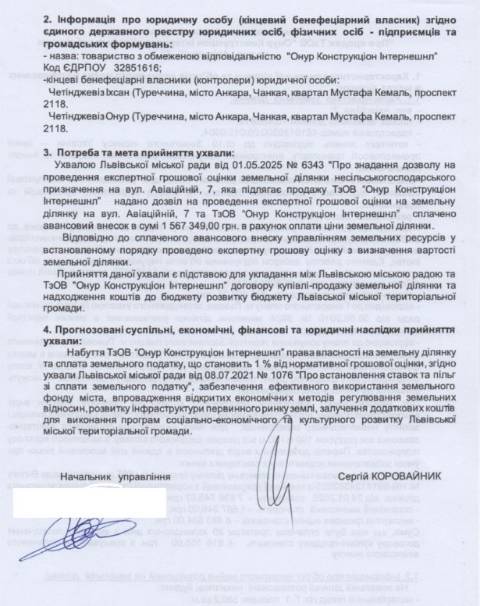 Згідно з документом, земельну ділянку площею 0,4688 га на вул. Авіаційній, 7, що перебуває у комунальній власності, планують продати ТОВ "Онур Конструкціон Інтернешнл", що з 2016 року орендує цю ділянку у міськради Львова за 235 102,35 грн в рік.