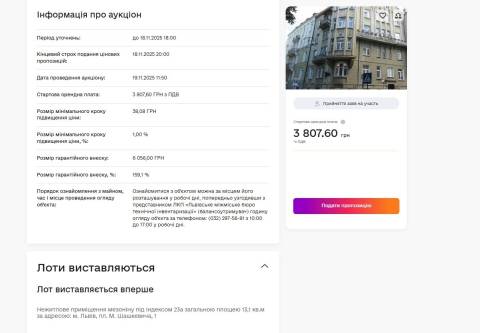 Згідно з закупівлею, йдеться про нежитлове приміщення мезоніну загальною площею 13,1 м² у 4-поверховому будинку в Галицькому районі Львова, що є частиною пам’ятки архітектури місцевого значення й перебуває на балансі ЛКП "Львівське міжміське бюро технічної інвентаризації".