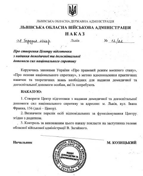 Максим Козицьким своїм розпорядженням постановив створити на території області центр з підготовки надання домедичної та догоспітальної допомоги сил національного спротиву.