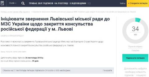 Вчора, 26 листопада, на порталі е-петицій була зареєстрована петиція Тараса Челепіса з вимогою ініціювати звернення Львівської міської ради до МЗС України щодо можливості повного закриття консульства Російської Федерації у Львові.