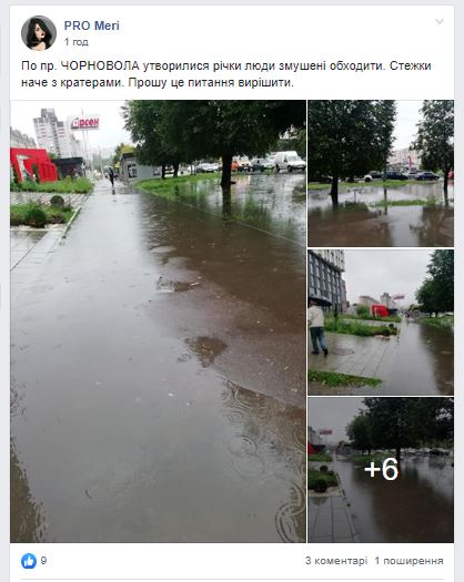"По проспекту Чорновола утворилися річки люди змушені обходити. Стежки наче з кратерами. Прошу це питання вирішити" – йдеться у повідомлення.