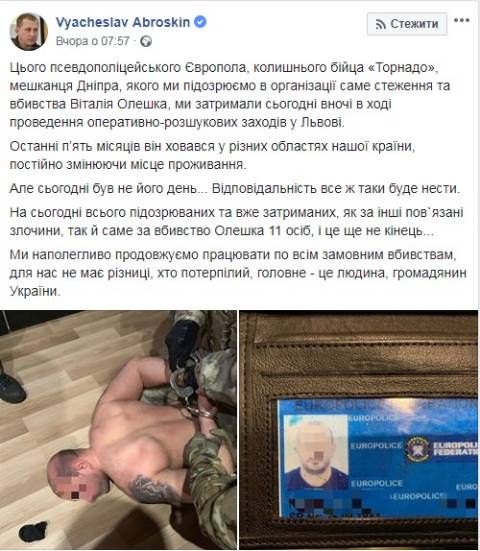"Цього псевдополіцейського Європола, колишнього бійца "Торнадо", мешканця Дніпра, якого ми підозрюємо в організації саме стеження та вбивства Віталія Олешка, ми затримали сьогодні вночі в ході проведення оперативно-розшукових заходів у Львові" – заявив Аброськін.