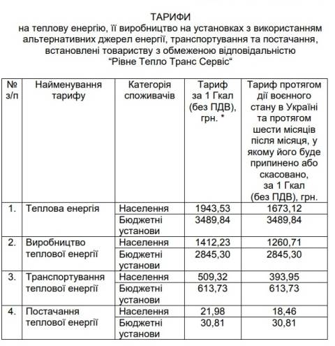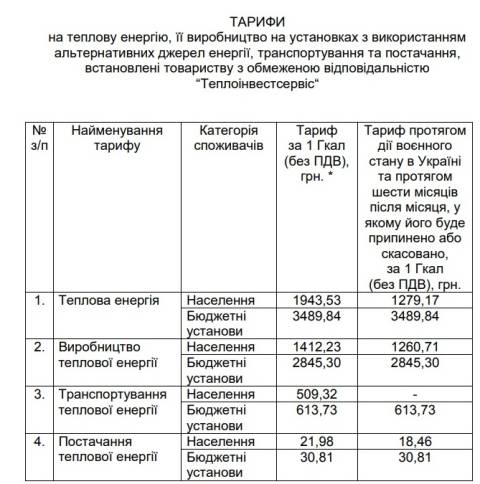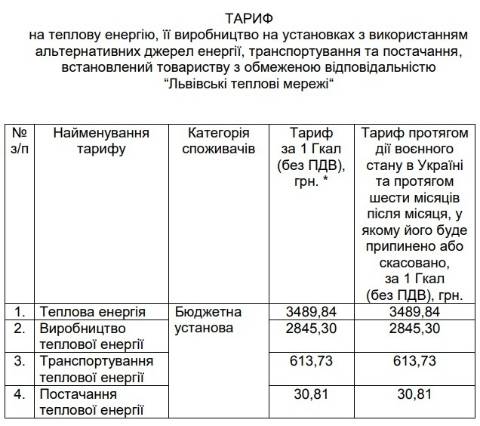 Згідно з документом, йдеться про встановлення тарифів для бюджетних установ Львова та населення на: