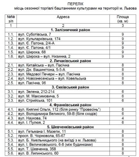 Зокрема, для впорядкування торгівлі баштанними культурами та покращання умов їх продажу міськрада визначила загалом 24 місць у Шевченківському, Франківському, Сихівському, Личаківському та Залізничному районах Львова.