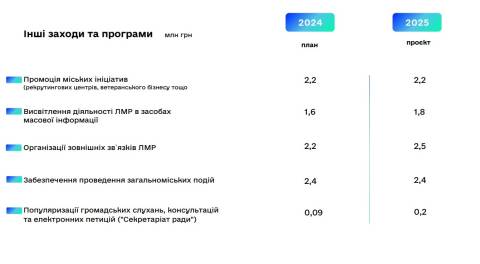 Крім цього, у бюджеті передбачено 12 млн грн на виконання рішень судів, 2,5 млн грн – на організацію зовнішніх зв'язків Львівської міськради, 1,8 млн грн – на висвітлення діяльності міськради у ЗМІ, 2,4 млн грн – на проведення загальноміських подій, 0,5 млн грн – на навчання та розвиток компетенцій чиновників і депутатів міськради.