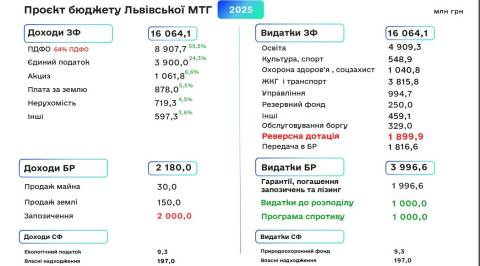 Доходи бюджету Львівської міської територіальної громади у 2025 році складатимуть 17 686,8 млн грн (доходи загального фонду бюджету – 17 300,5 млн грн, доходи спеціального фонду бюджету – 386,3 млн грн, у тому числі бюджету розвитку – 180 млн грн).
