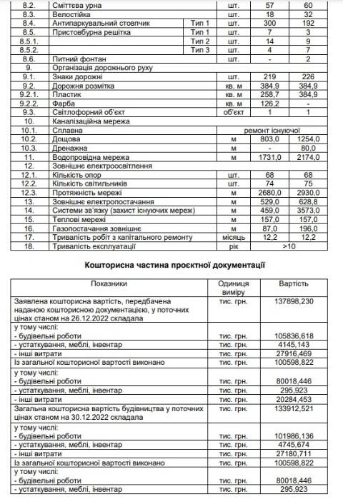 Згідно з документом, вартість ремонту вул. Пекарської та вул. Шімзерів станом на 30 грудня 2022 року становить 133 912 521 грн, з цієї суми 101 986 136 грн – виключно будівельні роботи.