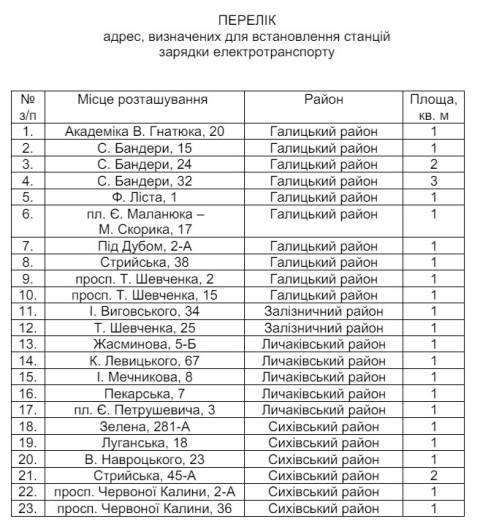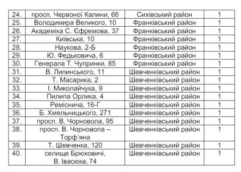 Зокрема, це площа Маланюка – вул. Скорика, 17, вул. Шевченка, 25 та 120, вул. Зелена, 281-А, вул. Масарика, 2, вул. Реміснича, 16-Г та проспект В. Чорновола, 95.
