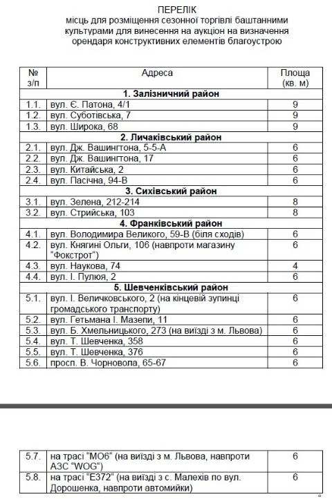 До 20 затверджених місць для торгівлі кавунами додали ще одне – на вул. Дж. Вашингтона, 17. Відтак конкурс оголошується на 21 місць з яких: 8 – у Шевченківському районі, по 4 – у Франківському та Личаківському районах, 3 – у Залізничному та 2 – у Сихівському.