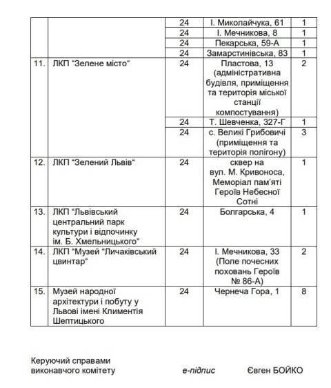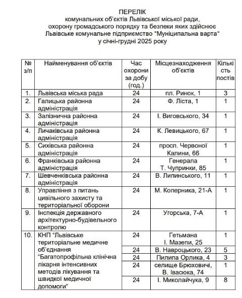 "З метою поліпшення роботи Львівської міської ради та її структурних підрозділів, а також комунальних підприємств, установ, організацій через забезпечення безпечних умов для їх функціонування виконавчий комітет вирішив затвердити перелік комунальних об'єктів Львівської міської ради, охорону громадського порядку та безпеки яких здійснює ЛКП "Муніципальна варта" у січні-грудні 2025 року" – йдеться у документі.