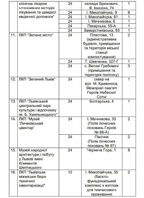 Охоронятимуть цьогоріч КНП "Львівське ТМО "Багатопрофільна клінічна лікарня інтенсивних методів лікування та швидкої медичної допомоги" (ТМО №1) на вул. Мазепи, 25, вул. Миколайчука, 9 та 61, вул. Навроцького, 23, вул. Пилипа Орлика, 4, вул. Мечникова, 8, вул. Пекарська, 59-а, вул. Івасюка, 74 у смт Брюховичі (загалом тут працюватимуть 22 пости охорони), будівлю міської Ратуші (3 пости охорони), Парк культури і відпочинку ім. Б. Хмельницького (1 пост охорони), Шевченківський гай (8 постів охорони) тощо.