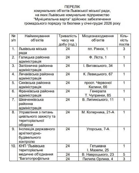 "З метою поліпшення роботи Львівської міської ради та її структурних підрозділів, а також комунальних підприємств, установ, організацій через забезпечення безпечних умов для їх функціонування, громадського порядку та безпеки, попередження та оперативного реагування на правопорушення й надзвичайні події, у зв’язку із загрозливою ситуацією, зумовленою військовим вторгненням РФ на територію України, для запобігання дезорганізації підприємств, установ, організацій, знищення або виведення з ладу об’єктів критичної інфраструктури затвердити перелік комунальних об’єктів Львівської міської ради, на яких ЛКП "Муніципальна варта“" здійснює забезпечення громадського порядку та безпеки у січні-грудні 2026 року" – йдеться у документі.
