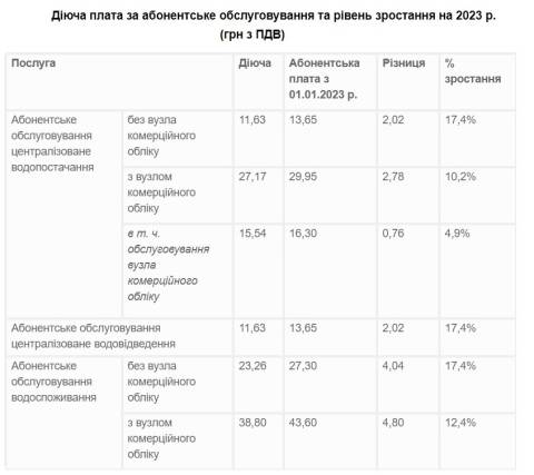 Зокрема, плата за централізоване водопостачання зросла на 17,4%, за централізоване водовідведення – на 17,4%, за обслуговування водоспоживання – на 17,4% без вузла комерційного обліку та на 12,4% з вузлом комерційного обліку.