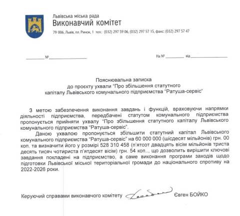 "Збільшити статутний капітал ЛКП "Ратуша-сервіс" на 60 000 000 грн та визначити його розмір у сумі 528 310 458 грн 54 коп." – йдеться в проєкті ухвали.