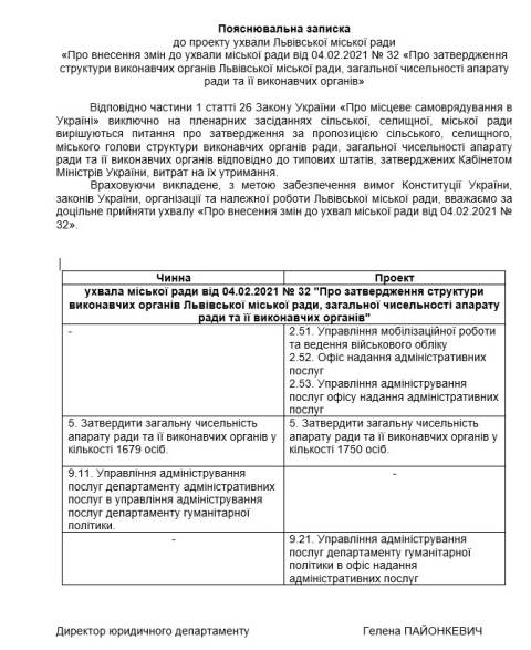 Згідно з документом, змінюється структура Львівської міськради, зокрема, створюється управління мобілізаційної роботи та ведення військового обліку, Офіс надання адміністративних послуг та управління адміністрування послуг.