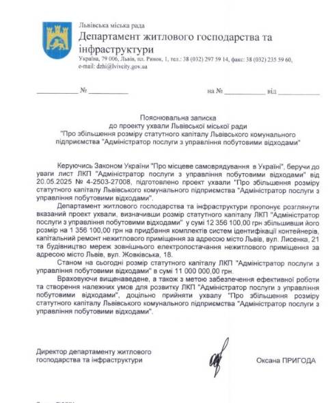У пояснювальній записці до проєкту ухвали вказано, що поповнення статутного капіталу цього підприємства з бюджету Львова зумовлене придбанням комплектів систем ідентифікації контейнерів, роботами з ремонту приміщень на вул. Лисенка, 21 та прокладанням мереж зовнішнього електропостачання у приміщенні на вул. Жовківській, 18.