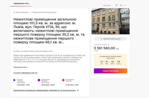 Управління комунальної власності Львівської міської ради оголосило аукціон у системі ProZorro з продажу нежитлових приміщень на вулиці Героїв УПА, 36 у Франківському районі Львова.