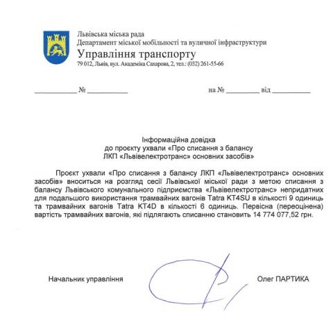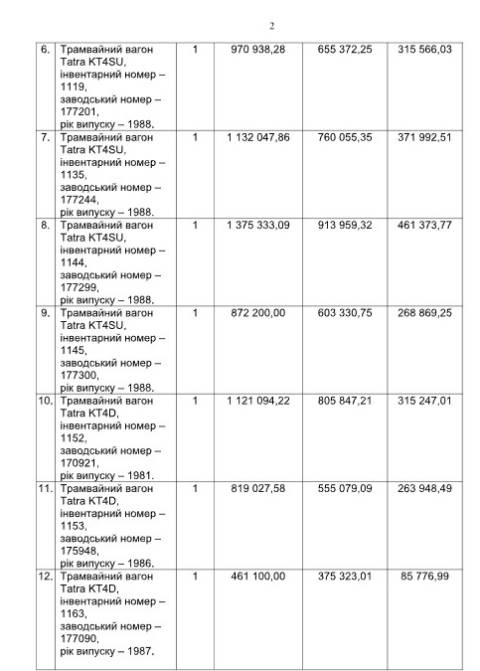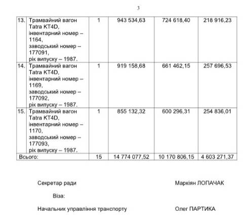 Йдеться про списання з балансу комунального підприємства через непридатність для подальшого використання 15 трамвайних вагонів Tatra 1981-1988 років випуску на загальну суму у 14 774 077,52 грн: