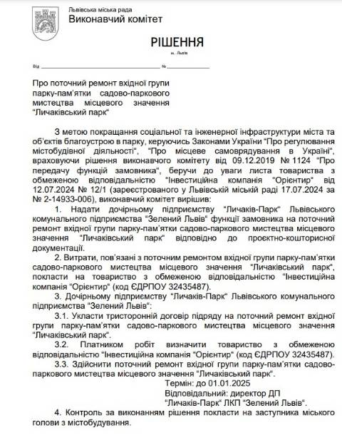 "З метою покращання соціальної та інженерної інфраструктури міста та об’єктів благоустрою в парку надати дочірньому підприємству "Личаків-Парк" ЛКП "Зелений Львів" функції замовника на поточний ремонт вхідної групи парку-пам’ятки садово-паркового мистецтва місцевого значення "Личаківський парк" відповідно до проєктно-кошторисної документації" – вказано у документі.