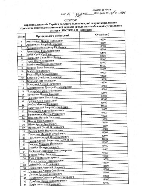Відтак, у листопаді 2018 року 170 народних депутатів отримали кошти для компенсації вартості оренди житла чи готельного номера. Додамо, що у жовтні цього року їх було 172.