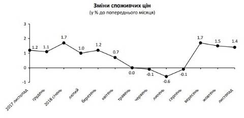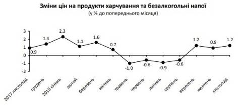 У листопаді, порівняно з жовтнем, ціни на продукти харчування та безалкогольні напої зросли на 1,2%.