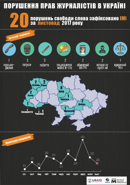 Згідно з результатами щомісячного моніторингу Інституту масової інформації "Барометр свободи слова", у листопаді цього року було зафіксовано 20 випадків порушень прав журналістів і свободи слова.