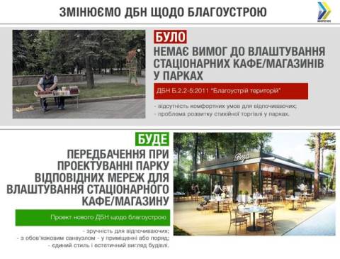 Міністерство планує переглянути державні будівельні норми щодо проектування у нових або реконструйованих парках відповідні інженерні мережі для розміщення невеликого сучасного кафе чи магазину.