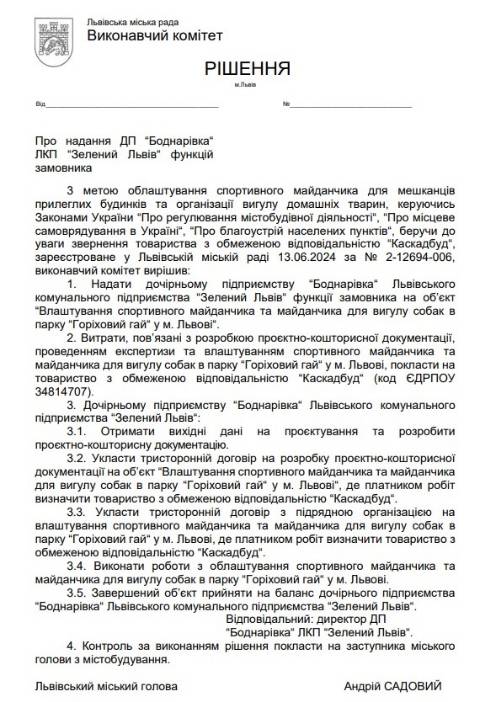 "3 метою облаштування спортивного майданчика для мешканців прилеглих будинків та організації вигулу домашніх тварин, надати дочірньому підприємству "Боднарівка" ЛКП "Зелений Львів" функції замовника на об’єкт "Влаштування спортивного майданчика та майданчика для вигулу собак в парку "Горіховий гай" у м. Львові" – вказано у документі.