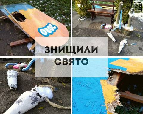 "Вночі п'яні молодики вщент розбили наші вимріяні плани на День Валентина: розтрощили арку і розчленували гномів (арку і скульптури виготовили наші працівники — Олена Кошельник і відомий художник Тарас Носар). А шкода, бо мала б бути романтична фотозона для закоханих" – написали на сторінці парку.
