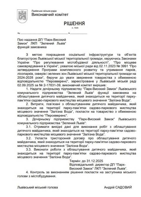 "З метою покращання соціальної інфраструктури та об’єктів благоустрою Львівської МТГ надати дочірньому підприємству "Парк-Високий Замок" ЛКП "Зелений Львів" функції замовника на облаштування дитячого майданчика, який знаходиться на території парку пам’ятки садово-паркового мистецтва місцевого значення "Залізна Вода" – вказано у документі.