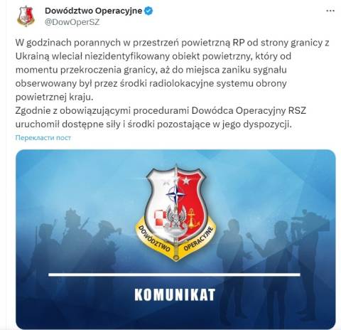 "У ранкові години в повітряний простір Республіки Польща з боку кордону з Україною влетів невідомий повітряний об'єкт, який з моменту перетину кордону і до моменту зникнення сигналу спостерігався радіолокаційними засобами системи протиповітряної оборони країни. Відповідно до чинних процедур, оперативний командувач задіяв наявні в його розпорядженні сили та засоби" – йдеться у повідомленні.