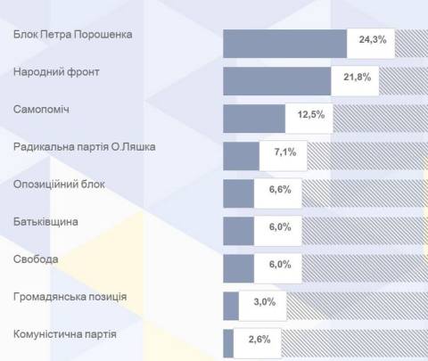 Зокрема, Блок Порошенка набирає 24,3% голосів, Народний фронт - 21,8%, Самопоміч - 12,5%, Радикальна партія Ляшка - 7,1%, Опозиційний блок - 6,6%, Батьківщина - 6,0%, Свобода - 6,0%. Інші партії не долають 5-відсоткового бар'єру.