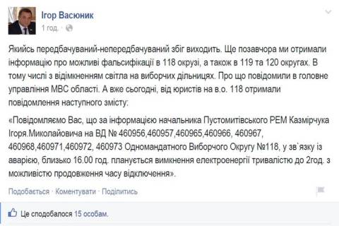 У ряді дільниць у 118 виборчому округу (Пустомитівський район, частина Личаківського та Шевченківського районів Львова) планують відключення електроенергії на 2 години.