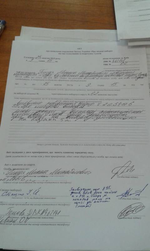 "Вранці на дільницю прийшов Микола Гинда з журналістським посвідченням від політичної партії "Сили людей". Представив нам агітки кандидата від Громадянської позиції Ігоря Данилихи, що були нібито наклеєні біля входу на дільницю. Вимагав членів ДВК підписати акт порушення. Наша секретар не зареєструвала його як журналіста. Оскільки наліпок ніхто з членів ДВК не бачив так як вони були за межами дільниці. Через деякий час цей самий Микола Гинда прийшов до нас з уже готовими актами порушення. В цей же час на дільницю прийшов сам Ігор Данилиха - між ними виникла словесна перепалка на тему незаконної агітації в день виборів. Журналіст вимагав підписати акт членами ДВК, щоб вони засвідчили порушення. Зрештою Голова і заступник підписали документ, але заступник підписав не як член ДВК, а в якості свідка, - щоб цей журналіст не заважав роботі членів ДВК. Між іншим, члени ДВК не мають права підписувати акти порушення. Це можуть робити лиже незалежні свідки-виборці.