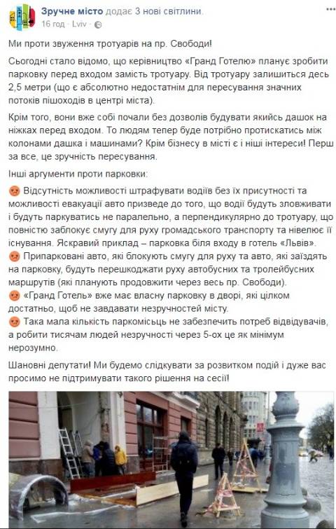 "Крім того, вони вже собі почали без дозволів будувати якийсь дашок на ніжках перед входом. То людям тепер буде потрібно протискатись між колонами дашка і машинами? Крім бізнесу в місті є і ніші інтереси! Перш за все, це – зручність пересування. Шановні депутати! Ми будемо слідкувати за розвитком подій і дуже вас просимо не підтримувати такого рішення на сесії!", – йдеться у повідомленні.