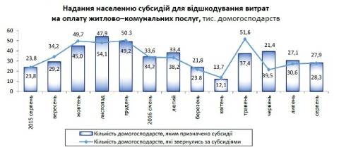 Загальна сума призначених субсидій становила 210,5 млн грн, а середній розмір призначеної субсидії на одну сім'ю становив 339,2 грн та збільшився у 1,6 раза, порівняно з серпнем минулого року.