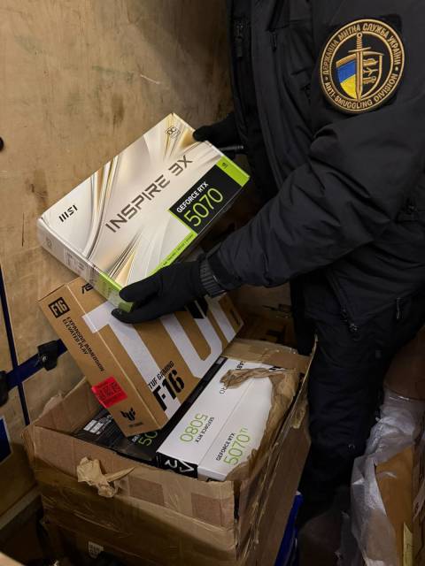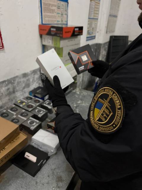 "Під час огляду мікроавтобуса працівники митниці виявили велику партію нової техніки: 7 ноутбуків Asus, Acemagic, Msi, Gigabyte; 10 смарт-годинників Garmin; 10 процесорів Amd, Intel; 4 планшети Samsung; 3 телефони Xiaomi та Samsung; 7 відеокарт і материнську плату.
