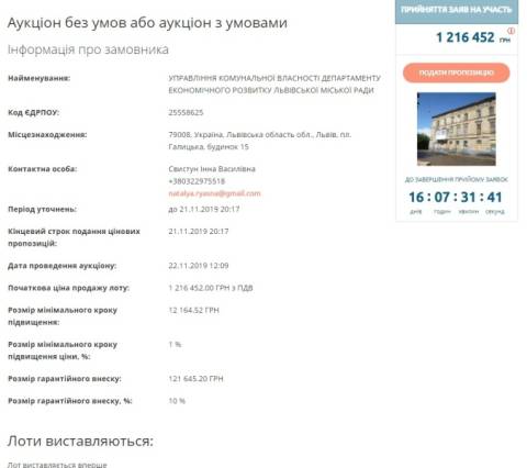 Аукціон стартує 22 листопада, а початкова вартість приміщення становить 1 216 452 грн.