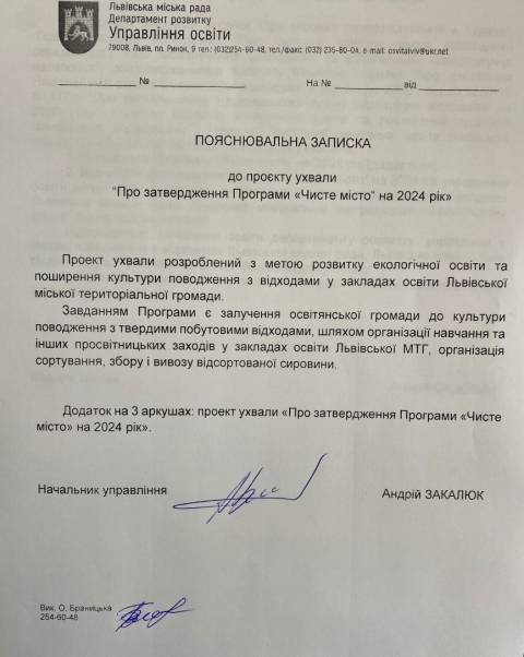 "З метою розвитку екологічної освіти та поширення культури поводження з відходами у закладах загальної середньої освіти Львівської МТГ міська рада ухвалила: затвердити програму "Чисте місто" на 2024 рік" – йдеться в проєкті ухвали.