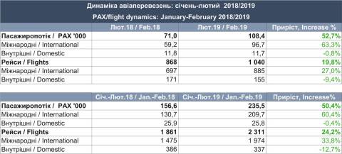 Загалом, за січень-лютий пасажиропотік зріс на 50,4%, в порівнянні з цими місяцями минулого року (156,6 тисяч пасажирів), і досяг позначки в 235,5 тисяч пасажирів.