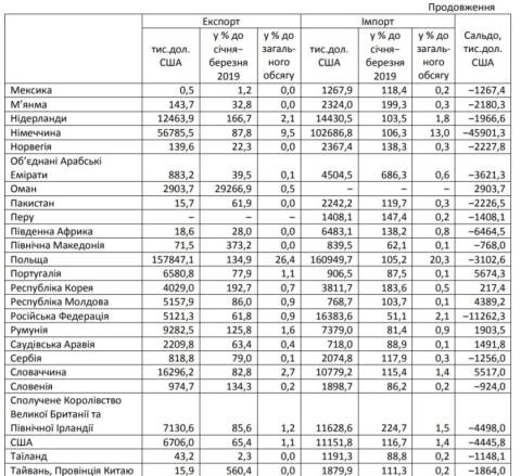 Експорт товарів у країни Євросоюзу становив 454,4 млн дол (76%) та збільшився, порівняно з січнем-березнем 2019 року, на 13,3%.