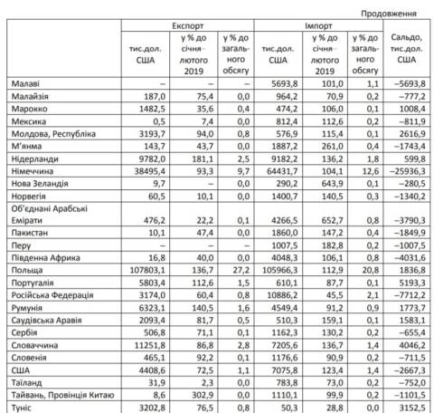 імпорту), Німеччину (12,6%) та Китай (11,1%). Імпорт товарів з країн Євросоюзу становив 289,2 млн дол (56,7%) та збільшився, порівняно з січнем-лютим 2019 року, на 12,5%.