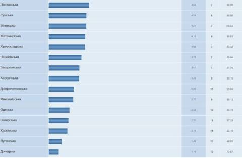 Щоправда, найменший відсоток опрацьованих протоколів надійшов з тих областей, де "Свобода" отримує мізерні результати. Наприклад, на Луганщині опрацьовано лише 48.36% протоколів, і цей регіон дав партії Тягнибока лише 1.46% голосів. Так само з Донеччиною, з цієї області ЦВК опрацювала 70.00% протоколів, а результат "Свободи" передбачливо невтішний – 1.15% голосів.