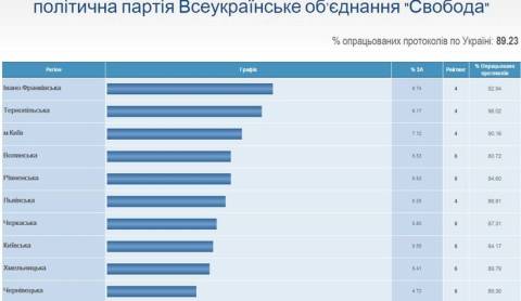 Водночас, в областях, де знаходиться базовий електорат "Свободи" і де вона йде четвертою за результатами голосування – Львівська, Тернопільська, Івано-Франківська, а також місто Київ – відсоток опрацьованих протоколів становить 86-90%.