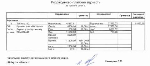 Із цих коштів Кулинич сплатила 37 035,03 грн різних відрахувань. Відтак, фактично виплачена заробітна плата чиновниці без податків, зборів та перерахувань становила 11 862,58 грн.