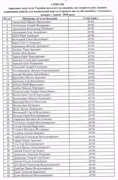 Відтак, у травні 2018 року 172 народних депутати отримали кошти для компенсації вартості оренди житла чи готельного номера. Додамо, що у квітні цього року їх було також 172.