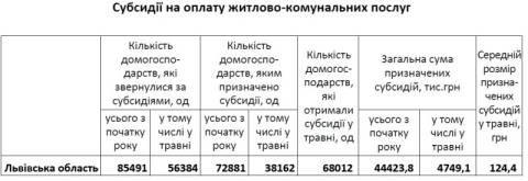 Субсидії для відшкодування витрат на оплату житлово-комунальних послуг отримали 72,9 тисяч домогосподарств. Загальна сума субсидій, призначених домогосподарствам для відшкодування витрат на оплату житлово-комунальних послуг, у січні-травні становила 44,4 млн грн (у січні-травні 2018 року – 20,6 млн грн), з них у містах – 26,3 млн грн.