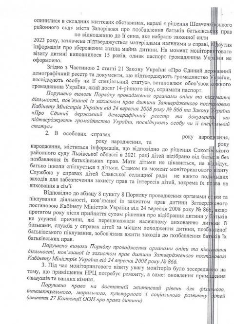 - порушення вимог Порядку провадження органами опіки та піклування діяльності, пов'язаної з захистом прав дитини (дитині, якій виповнилось 15 років, не оформили український паспорт, а також не забезпечили права на виховання в сім'ї для іншої дитини);