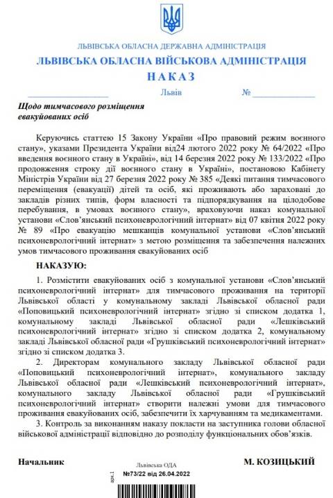 "Розмістити евакуйованих осіб з комунальної установи "Слов’янський психоневрологічний інтернат" для тимчасового проживання на території Львівської області у комунальному закладі ЛОР "Поповицький психоневрологічний інтернат", комунальному закладі ЛОР "Лешківський психоневрологічний інтернат", комунальному закладі ЛОР "Грушківський психоневрологічний інтернат" – йдеться у розпорядженні.