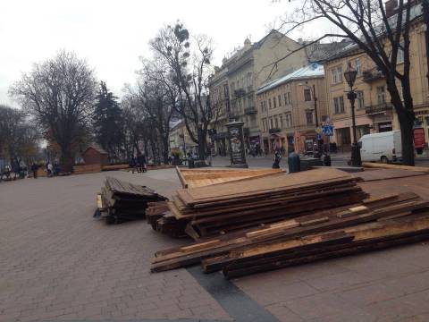 Сьогодні, 17 листопада, на площі перед Львівською оперою розпочалась підготовка до Різдвяного ярмарку: тут вже встановлюють дерев'яні будиночки, у яких здійснюватиметься торгівля.